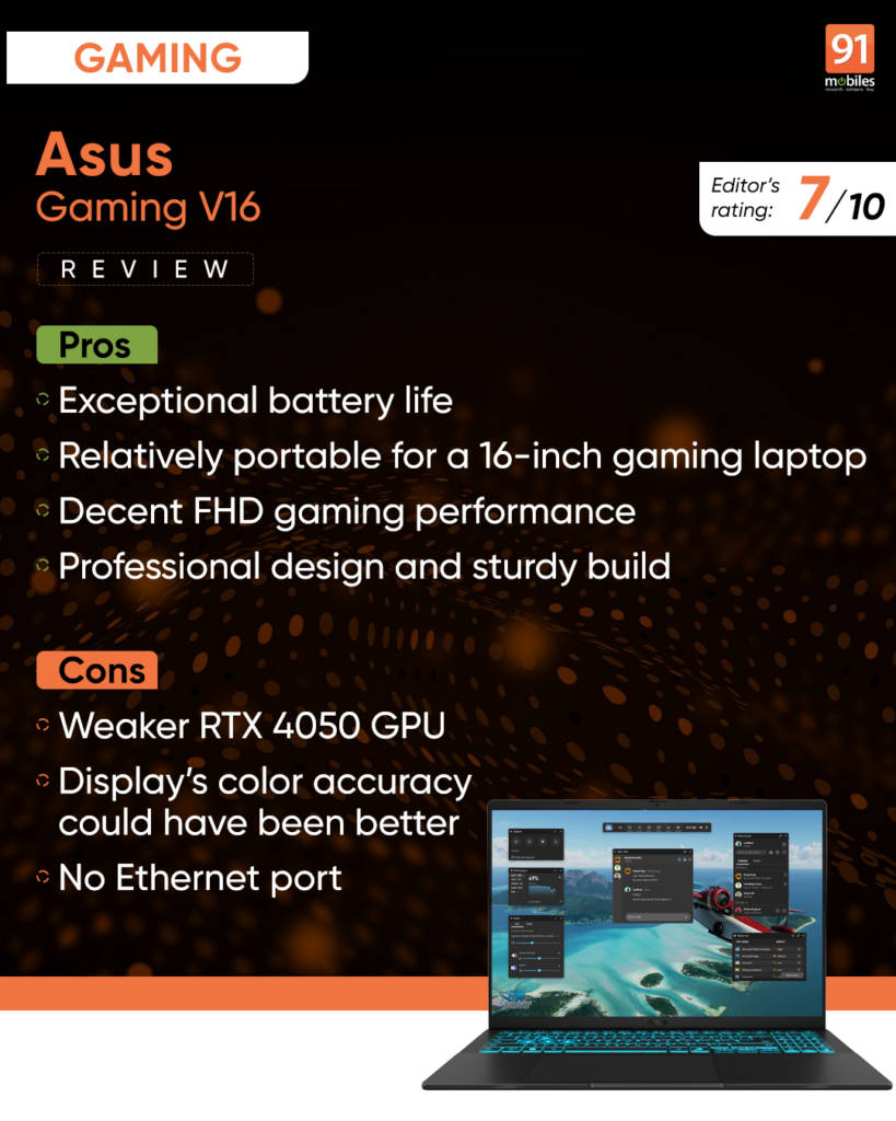 However, the same configuration, when coupled with the functional design of the V16, makes it a unique proposition for college students and professional users who want to carry a gaming laptop alongside their daily workloads. The design doesn’t attract many eyeballs, and the exceptionally long battery life means you don’t need to carry a charger in the backpack. Sure, the gaming performance is a bit of a compromise, but it’s not like you can’t game on it at all. The slight compromise in FPS for a significant boost in battery life is something that will appeal to a specific kind of user, and if that’s you, the ASUS Gaming V16 is a pretty good option.