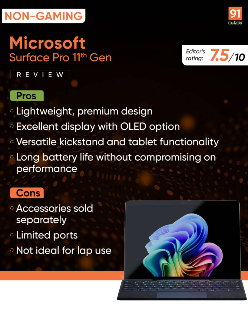 The Surface Pro 11th-Gen comes at a starting price tag of Rs. 1.15L, and impresses with its refined design, premium build quality, and versatile 2-in-1 functionality. Additionally, the shift to an ARM-based processor brings significant improvements in battery life and overall efficiency, making it a compelling option for professionals and students who prioritize portability and all-day productivity. The vibrant display, excellent audio quality, and comfortable keyboard further enhance the user experience.