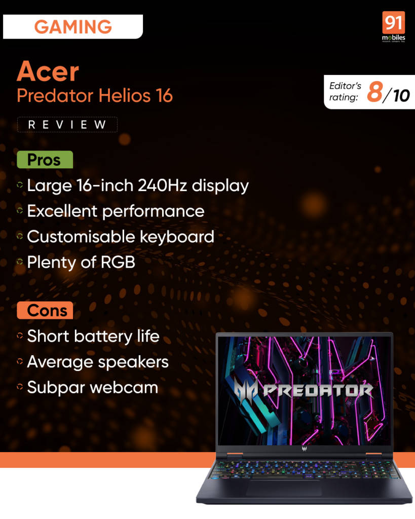 So, the big question. Is the Acer Predator Helios 16 worth it? Well, having tested the laptop, and extensively gaming on it for the last couple of weeks, I’d say it’s a fantastic choice for gamers and creators who want a high-performance laptop with a vibrant display, customizable RGB lighting, and robust build quality. While it has its drawbacks, like short battery life and average speakers, it excels in performance and visual appeal. For a price tag of Rs. 2,49,990, it offers incredible value for money too.
