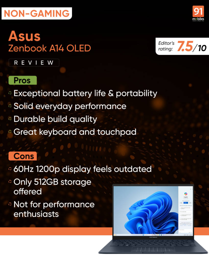 There’s also an excellent battery life of over 10 hours at the very least, which should be fine for most users. However, if you can compromise a bit on the performance front and want to squeeze more juice, the Acer Swift 14 AI with the Intel Core Ultra 5 226V processor is an excellent option. Further, if your use case doesn’t involve running x86 applications, a laptop powered by the Snapdragon X Elite chipset, such as the ASUS VivoBook S15 OLED can also be considered.