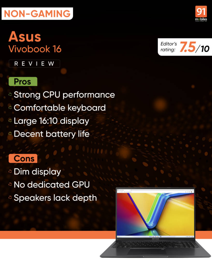 The ASUS Vivobook 16 is a well-rounded machine that excels at everyday productivity, media consumption, and light creative work. Its strong processor, decent build quality, and comfortable keyboard make it a solid choice for students and professionals who need a reliable workhorse. However, its dim display, lack of a dedicated GPU, and middling battery life hold it back from being a complete package. If you need a laptop for work, web browsing, or maybe even a little casual gaming, the Vivobook 16 offers good value for money. But if you’re a content creator or a gamer looking for more graphical power, you might want to consider alternatives with dedicated GPUs.