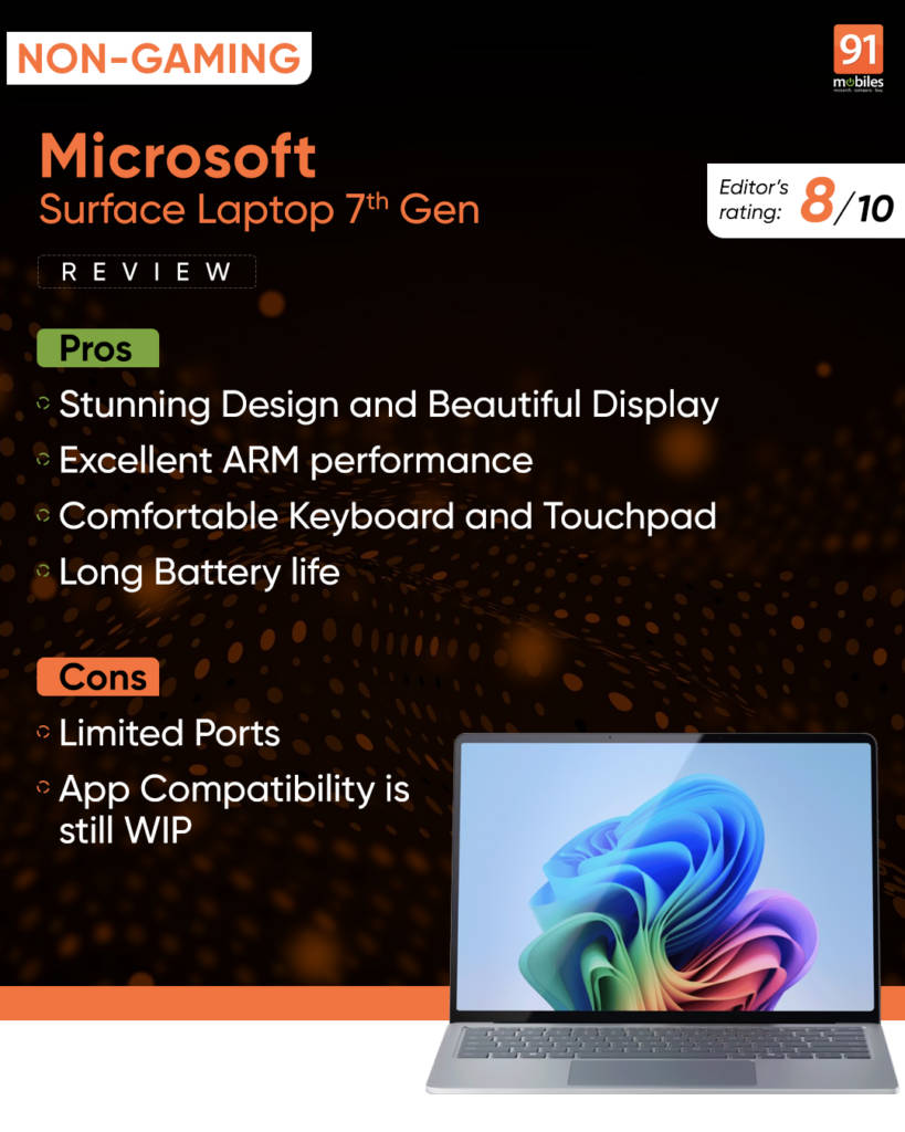 The Microsoft Surface Laptop 7th Gen is a premium laptop with a premium price. It’s not the most affordable option, but it offers a lot for the money. This includes a stunning design, a beautiful display, exceptional battery life, and significantly improved performance thanks to the Snapdragon X Elite. Priced at Rs. 1,59,990, and given its AI-powered features, excellent battery life, and MacBook-like efficiency, it’s a solid choice for professionals and students.