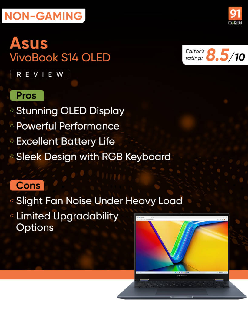 Priced at Rs. 1,04,990, the ASUS Vivobook S 14 delivers a compelling blend of performance, features, and battery life that makes it a strong contender against its rivals. The laptop’s standout feature is undoubtedly its vibrant OLED display, which, coupled with the AMD Ryzen AI 9 HX 370 processor, is more than capable of handling everyday tasks, multitasking, and even casual gaming, outperforming competitors like the Snapdragon X Elite and Intel Core 200V processors.