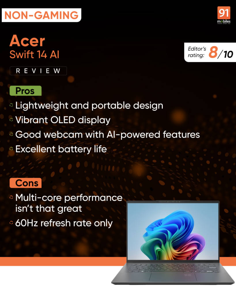 With a starting price tag of Rs. 89,999, the Acer Swift 14 AI is a compelling ultrabook offering a blend of style, performance, and impressive battery life. Its vibrant OLED display delivers an immersive visual experience, while the powerful Intel Core Ultra 5 226V processor ensures smooth handling of demanding tasks. It’s not the most powerful chipset on the market, but it’s still quite reliable and offers unmatched battery life.