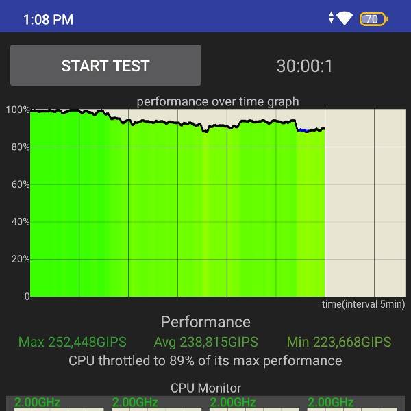 Everyday usage is a breeze on this smartphone. The Lava Blaze Curve did not stutter or freeze while scrolling, browsing, and multitasking. As for gaming, the handset successfully handled graphically-intensive games such as Call of Duty, BGMI, and Real Racing 3 with moderate graphics settings. There was a minor spike in temperature, roughly five degrees after every game, which is acceptable given it is not a performance-centric smartphone. The CPU Throttle test, with 50 threads for 30 minutes, shows the smartphone can run at 89 percent of its peak performance when stressed. This means that the handset should run fine even under strenuous load.