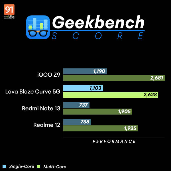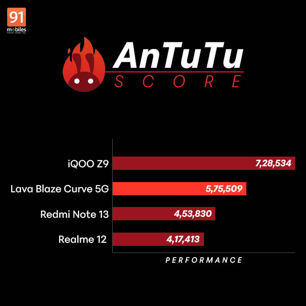 The Lava Blaze Curve 5G performs admirably, owing to its MediaTek Dimensity 7050 SoC, 8GB of RAM, and either 128GB or 256GB storage onboard. Since there is no microSD card slot on the device, storage needs to be considered beforehand. The handset achieved 5,75,509 on AnTuTu. Additionally, on Geekbench, it returned a score of 1,103 points on the single-core test and 2,628 points on the multi-core test. These are respectable benchmark scores for a sub-Rs 20,000 smartphone and also outshine those from its competitor, the Redmi Note 13.