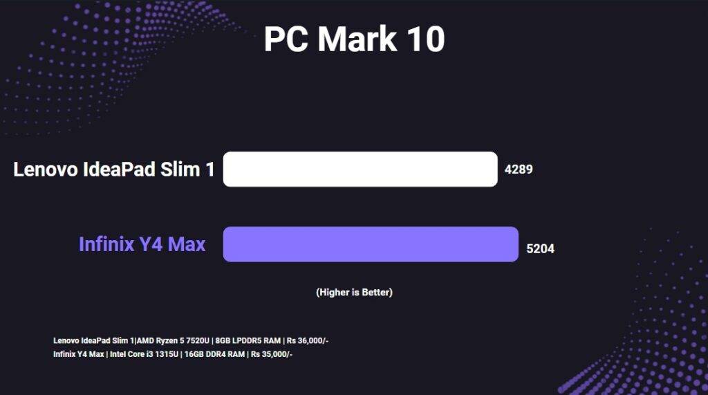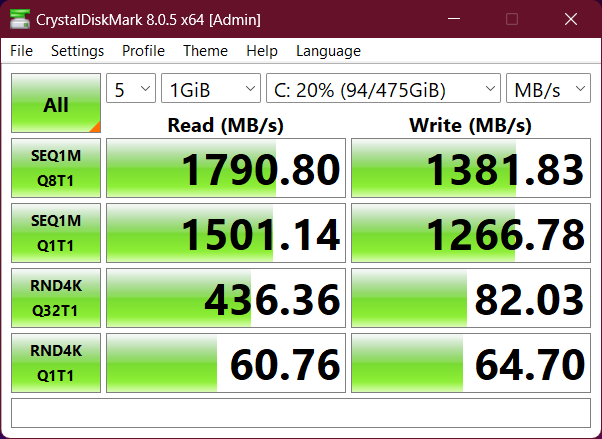 Despite having a PCIe Gen 4.0 SSD, performance is not up to the mark. In CrystalDiskMark the maximum sequential read and write speeds were around 1,800MBps and 1,400MBps, respectively. While these speeds are not low for daily workflows, the storage drive is clearly not being used at its full potential.