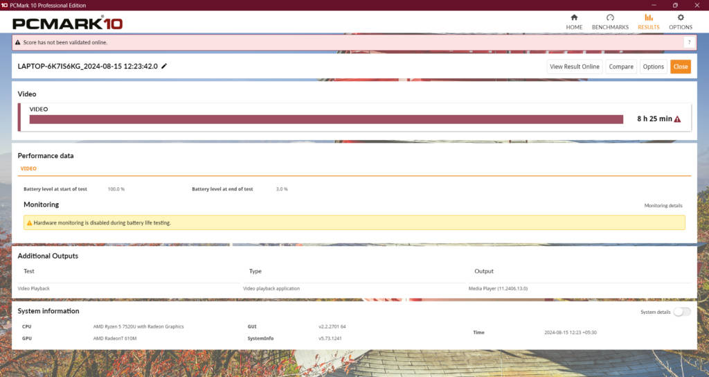 The laptop features a 42Whr battery which is comparatively smaller, especially for a 15-inch notebook. Having said that, the battery backup is actually quite good. I was able to use it continuously for 7 hours before I had to plug in the 65W charger. Even in PCMark 10’s Video battery benchmark, the laptop scored 8 hours and 25 minutes at 80 percent brightness.