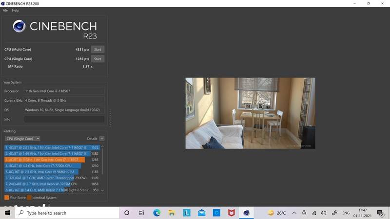 The Yoga 9i’s processing capabilities rest on the Intel 11th-gen i7-1185G7 processor with four cores and eight threads. It employs a 10nm SuperFin manufacturing process, with the max frequency on each of the i7-1185G7’s four cores set to 4.8GHz under sustained load. The Yoga 9i is part of Intel’s Evo platform which means that it’s able to provide lighting fast wake up from sleep speeds, at least 10 hours of battery life at FHD resolution and more. My usage of the Yoga 9i included binge-watching a couple of TV series, typing up this review while having a dozen Chrome tabs operating simultaneously, and the usual day-to-day tasks. I consistently got up to 4-5 hours of screen-on time with the screen resolution set to 4K. The rather thin chassis design doesn’t leave a lot of room for thermal outlets and as a result, the Yoga 9i got a little too hot after running relatively stressful tasks such as Cinebench R23. This was a common theme during my usage of the device and there were quite a few instances of thermal throttling.