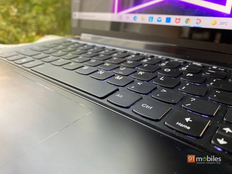 Lenovo employs a standard chiclet-style six-row keyboard that has average travel and a reasonably quiet typing experience. The backlighting is white in colour and has two levels of intensity making it easy to type in the dark. The keyboard offers a good typing experience, though I did wish the enter key was slightly bigger. The trackpad below sits extremely flush with the chassis and camouflages itself in the black colour almost to the point of invisibility. The haptic feedback on the trackpad mimics the realistic press of a button, which is appreciated but I do feel the overall touch response could have been better.