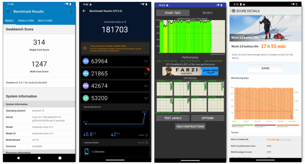 - Keeping the Moto E13’s lights on is a 5,000mAh battery, which is rated to last up to 36 days on a single charge. Considering the phone will not be used for heavy gaming, the claimed battery life seems plausible. I was consistently getting more than a day’s battery life between charges on moderate to heavy usage. That said, my usage did not include binge-watching movies/ web series for hours. On the PC Mark battery 3.0 test, the handset returned with an impressive score of 17 hours and 55 minutes. What’s not so impressive; however, is the phone’s charging. The Moto E13 ships with a 10W charger, which takes close to 3 hours to juice up a dead battery to 100 percent.