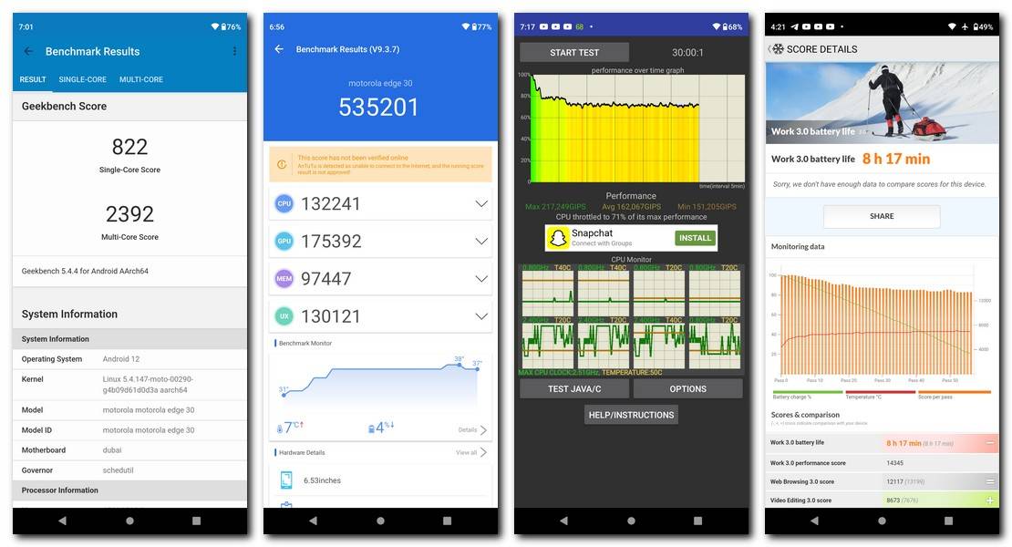 - Performance-wise the Qualcomm Snapdragon 778G+ handled the number crunching on the device. The phone’s rather thin design makes it susceptible to thermal throttling. However, for users who do not demand extreme processing prowess from their devices, the Motorola Edge 30 is a capable everyday smartphone. I put the phone through its paces for tasks like using multiple tabs in Google Chrome, some light photo editing and opening a bunch of social media apps. Not once did I come up short or disappointed.