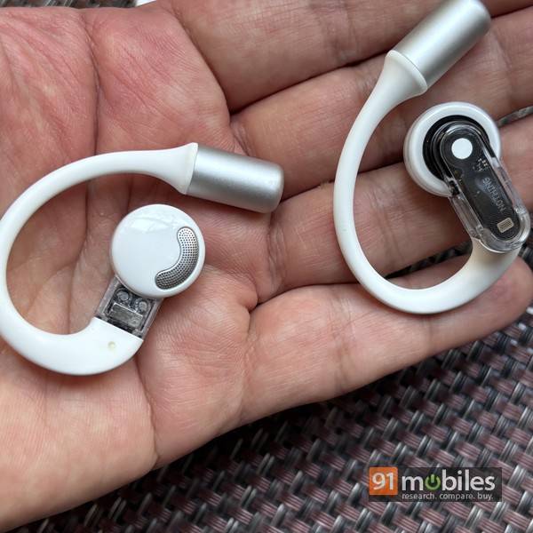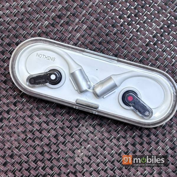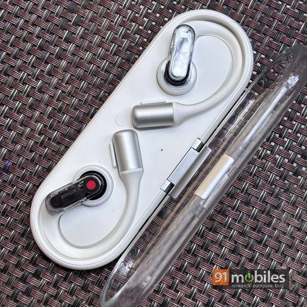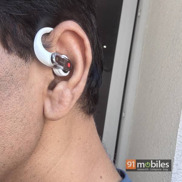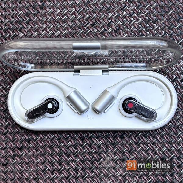 The signature design Nothing is known for continues, with the case featuring a transparent lid that clearly shows what’s inside. The elongated, oval-shaped case has smooth, rounded corners and a white base. A metal hinge and a Type-C port are placed on the back. The buds themselves feature an over-the-ear hook, with the earbud on one end and a silver cylinder at the other end. The latter acts as a counterweight and helps balance the bud on your ear. The buds rest outside on your ear canal when you’re wearing them, and allow ambient sound to enter, even when you’re listening to music. The buds are circular and sport a smooth finish, with the speaker facing inward. The buds make a rattling sound inside the case when it’s shaken, so that’s something to take note of. It’s not really a deal breaker, though.Also worth mentioning that the buds are IP54 rated and can handle a bit of rain and sweat. Most importantly, they’re extremely comfortable to wear over long durations, and those who have issues with the vacuum effect created by in-ear buds would find them especially comfy. While the 8.1g is on the heavier side compared to conventional earbuds, the Ear (open) don’t really feel heavy thanks to the soft-touch, flexible ear hooks and the fact that most of the weight rests on your ears.