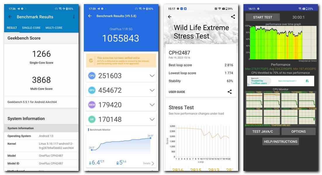 - Qualcomm’s Snapdragon 8+ Gen 1 is the silicone of choice on the OnePlus 11R, like it was on last year’s OnePlus 10T (review). There’s little doubt in my mind that even in 2023 and for a couple more years after it, the 11R will remain a capable, performance-focused handset. On Antutu V9, the 11R got an overall result of 1,055,843 which is just shy of what the latest 8 Gen 2 can reproduce. I also ran the Geekbench 5 synthetic benchmark and the single-core and multi-core results were actually higher than what I saw on the 10T.
