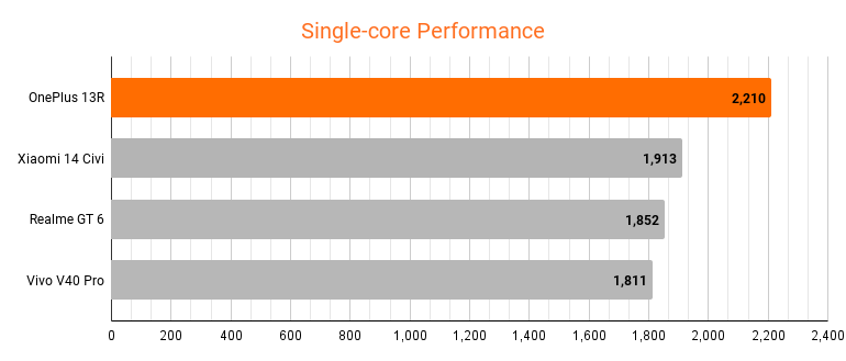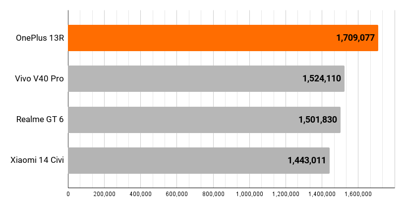 The Snapdragon 8 Gen 3-powered OnePlus 13R understandably scores better than the Snapdragon 8s Gen 3-powered Xiaomi 14 Civi and Realme GT 6 in the AnTuTu benchmark test. It is, after all, a more powerful chipset. The OnePlus 13R also edges out the Vivo V40 Pro, which is powered by the MediaTek Dimensity 9200+ SoC.