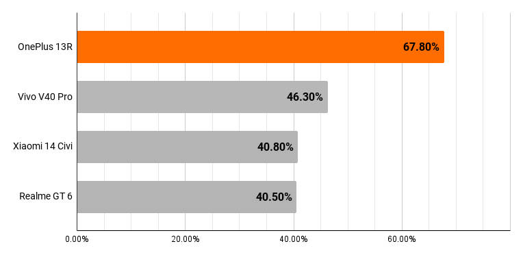 | Gaming (FPS) | Rank 1 – OnePlus 13R/Realme GT 6 Rank 2 – Vivo V40 Pro Rank 3 – Xiaomi 14 Civi |