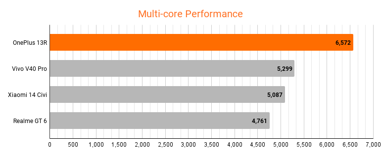 OnePlus 13R once again outperforms the competition in the Geekbench test. Being one of the few Snapdragon 8 Gen 3-powered phones in the sub-Rs 50,000 segment is definitely a plus point for OnePlus. Despite being a performance-centric phone, the Realme GT 6 performed poorer than the rest in the multi-core test.