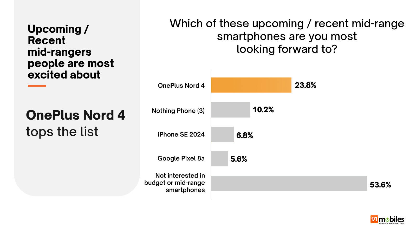 - When asked about the upcoming/recent mid-range smartphone they were most excited about, the OnePlus Nord 4 led the charts with 23.8 percent votes. The other options included Nothing Phone (3), iPhone SE 2024, and Google Pixel 8a.
