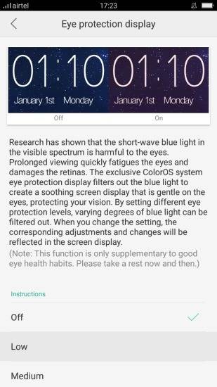 The OPPO F1s’ screen also offers an Eye Protection mode that acts as a blue light filter to make display more comfortable for reading, especially at night. The mode is customisable too, and you can choose between low, medium and high depending upon your preferences and the levels of blue light you want to filter out. The Eye Protection mode can be activated in a jiffy using the quick settings.