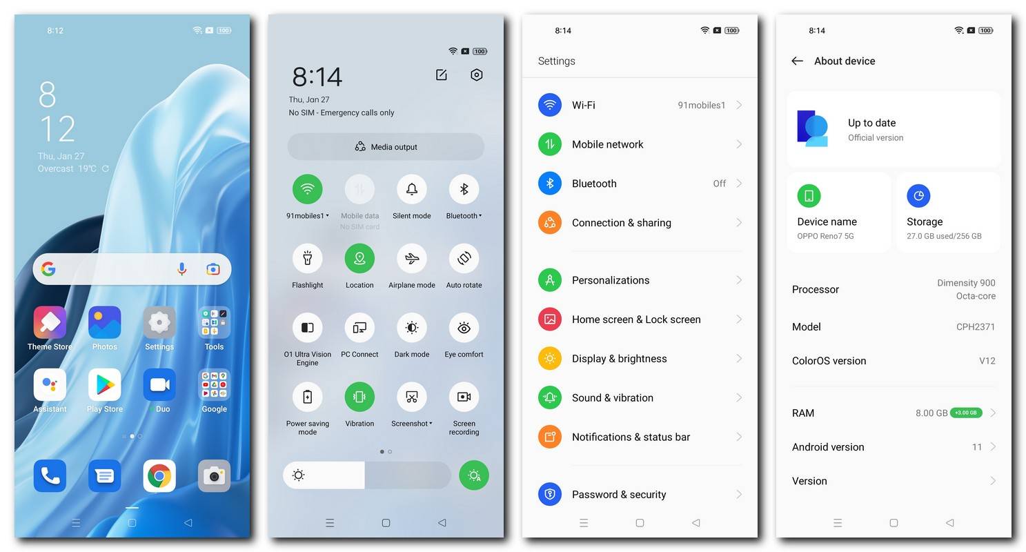 There is a single speaker present on the bottom with shallow sound quality, and the lack of stereo output is a bummer. A fingerprint sensor of the optical variety is employed on the Reno7 and its authentication speeds are quick. 5G capabilities on the device exist but there is no telecom infrastructure in place to utilise it. The 4G LTE speeds on Jio’s Noida network worked as well as expected and without a hitch. Speaking of software, ColorOS 12, based on Android 11, is running on the device and it’s a bit disappointing that the phone doesn’t ship with Android 12 out of the box. Worth mentioning that ColorOS has become quite user-friendly, with thematic customisations, spaced-out icons, and not much bloatware.