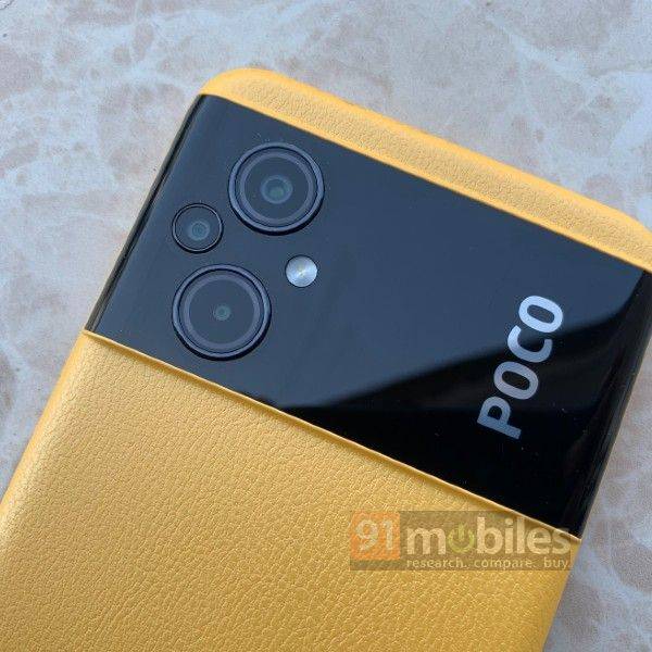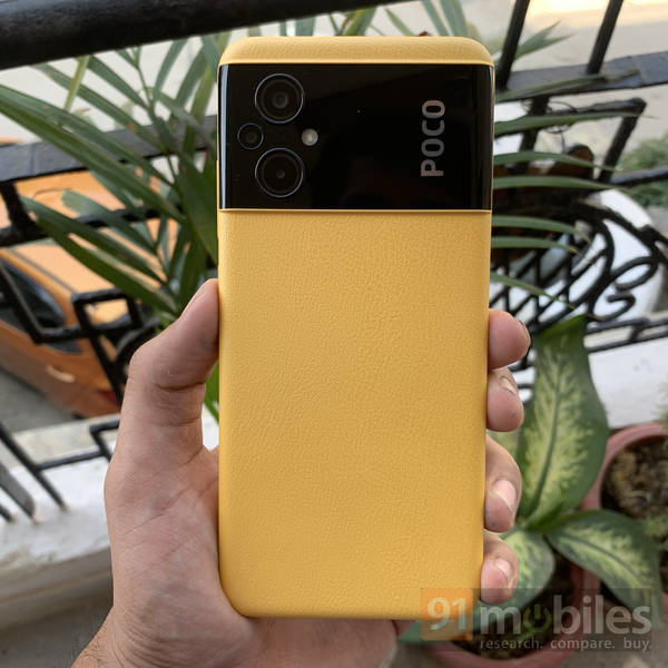 - The POCO M5 takes its design cues from its predecessor, the POCO M4 5G. To wit, the M5 flaunts a dual-tone finish with faux leather back, which is soft to the touch, offers a great in-hand feel, and doesn’t attract any fingerprints or smudges whatsoever. The phone also sports flat edges which pave the way for a comfortable grip and touts a striking camera island that runs across the back panel horizontally. The latter keeps the POCO M5 steady while lying flat on the surface. Speaking of the camera island, the array encompasses a triple camera setup, as well as an LED flash module. The module also incorporates the company’s branding and comes stratified with a glastic layer, which is not fingerprint resistant.