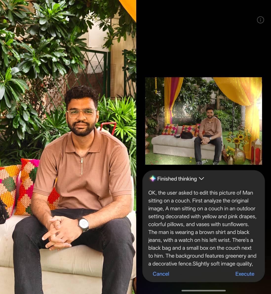 There’s currently no other tool quite like this, not just in the mid-range price band, but even among flagship offerings. The feature proves especially useful in situations where you might feel underdressed, like arriving at a party and realising your outfit doesn’t match the vibe. Just snap a photo, prompt the AI Edit Genie to style you appropriately, and voila, the results are visually impressive and perfectly suited for sharing on social media.