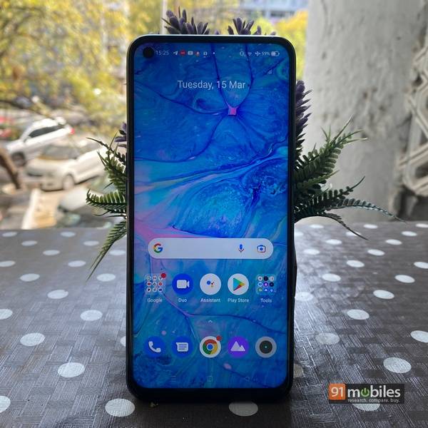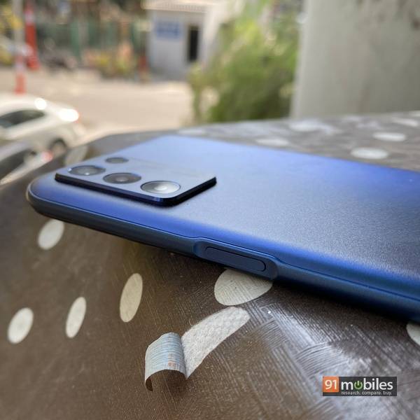 Right off the bat, I noticed that the Realme 9 5G SE has a bit of heft to it and the device felt quite heavy in my hand. In fact, weighing in at around 200g, the handset is among the chunkier phones in the segment, and that’s despite the device utilising a unibody polycarbonate build. Thankfully, unlike the herd of glossy-back phones, the Realme 9 5G SE makes use of a matte finish on the back, which will not go unappreciated by buyers. I was sent the Azure Glow variant for review which comprises a single deep blue colour scheme running across the length and the width of the chassis. In fact, the colour seeps into the camera housing as well, ensuring continuity in the design of the phone. And, since we’re on the subject of the phone’s camera module, you should know that the optics are positioned towards the top-left of the set in a typical inverted L shape. As for the rest of the I/O, the device offers a side-mounted fingerprint sensor that doubles up as the power button. The unit ships with a volume rocker on the opposite fascia, and touts a USB Type-C port, a 3.5mm headphone jack, and a speaker grille at the bottom. On the whole, the Realme 9 SE 5G offers a tasteful design, however, I wish the company would’ve included stereo speakers with the phone. As things stand, the device comes across as the “odd one out”, given how most competing phones provide a better audio setup.