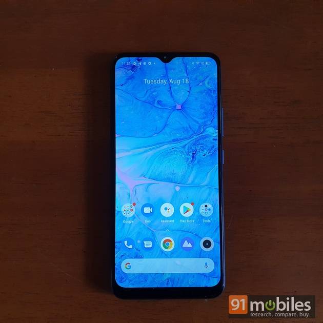 Realme has kept the design of the C12 basic and suited to the needs of the target audience. The materials used match the cost of the device and in my mind, there can be no complaints at its price point. Consequently, we get a unibody plastic design but with a kind of textured matte finish seen on previous C series phones. Two diagonal lines separate the back of the phone in three gradient finishes of blue, all of which shine differently when light is thrown at it. Realme is calling it the Geometric Gradient design. There are two colour options, Power Blue and Power Black of which I was given the former for review purposes. There is no case but the plastic does not get scratched as easily as some of Samsung’s pricier Galaxy M series phones. The device is slightly on the heavier side thanks to a mammoth 6,000mAh battery inside.