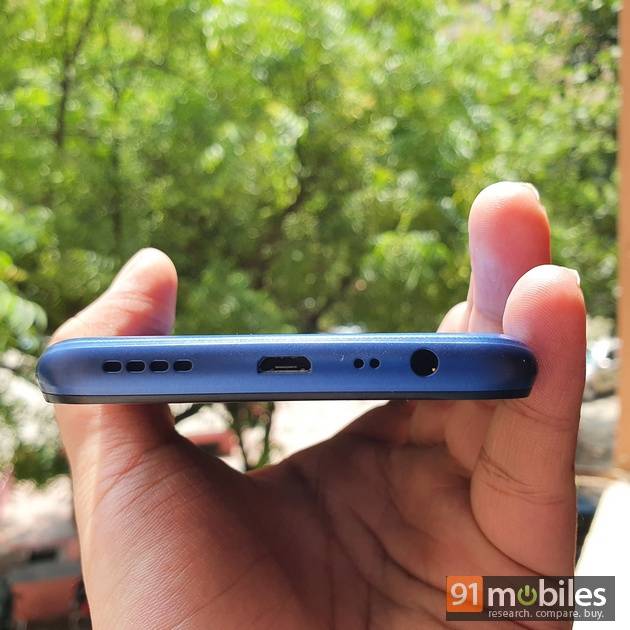 The triple camera housing on the back is in a square-shaped module, with the lenses and flash arranged almost the same as the C11. There is also a physical fingerprint sensor (which was absent on the C11), on the back of the device placed slightly higher than I would’ve wanted, with the Realme branding near the bottom. The back panel doesn’t curve much at the edges, but the thick and girthy design of the phone does give a firm grip while using the phone with one hand. As for ports, the phone features the standard C series lineup of a 3.5mm headphone jack, micro-USB port, and speaker grille. The volume rocker and power buttons are placed on the right while the dual-SIM + microSD slot is present on the left.