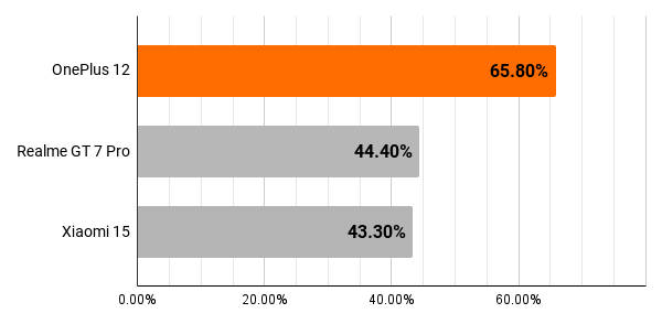 The Realme GT 7 Pro excels in battery performance with its chunky 5,800mAh unit, which comfortably lasts a full day even under heavy usage. The handset consumed an aggregate of 21 percent during our YouTube video streaming and gaming tests. Moreover, its results in the PCMark battery and charging speed test surpass those of close competitors like the OnePlus 12 and Xiaomi 15, cementing its position as a leader in battery efficiency. The GT 7 Pro takes roughly 40 minutes to achieve a full 100 percent charge from 20 percent. You can read more about the smartphone’s battery performance in our detailed review.
