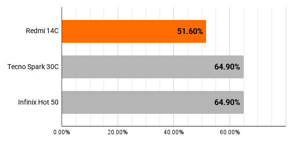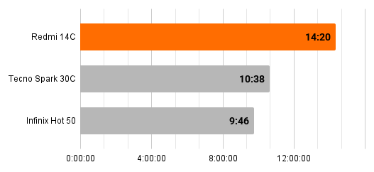 | Redmi 14C 5G | 5,160mAh | 84 minutes (18W) |