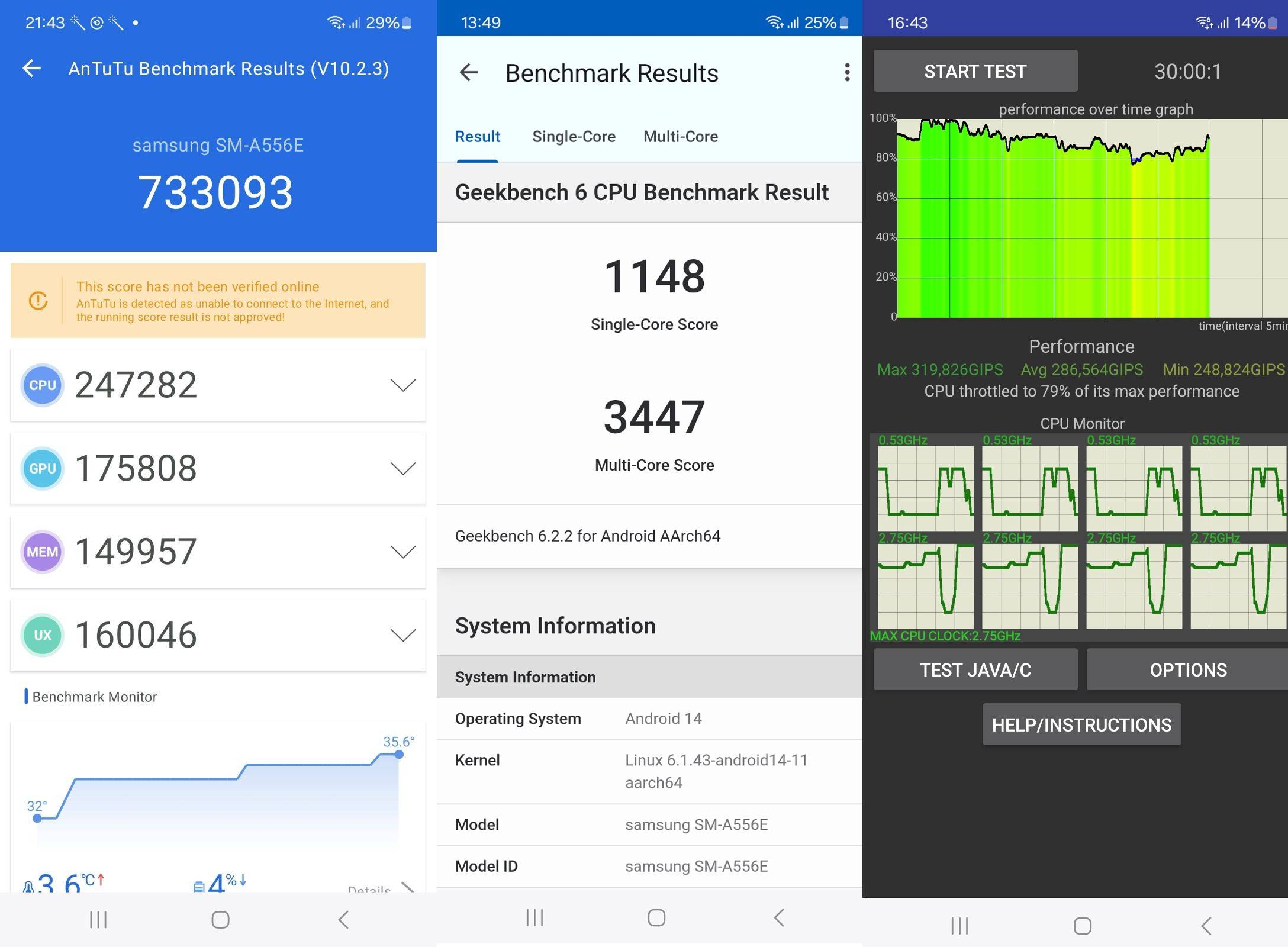 At the heart of the Samsung Galaxy A55 5G lies the in-house Exynos 1480 SoC, paired with up to 12GB of RAM and 256GB of onboard storage. It is a better chipset than the Galaxy A54’s Exynos 1380 SoC both synthetically and in real-world performance. Regarding synthetic benchmark scores, the handset achieved 7,33,093 on AnTuTu, while its Geekbench score stands at 1,148 for the single-core test and 3,447 for the multi-core test. The handset performs at 79 percent of its peak performance during the CPU Throttle test. These are respectable scores for a mid-range smartphone. Let’s find out its real-world performance.