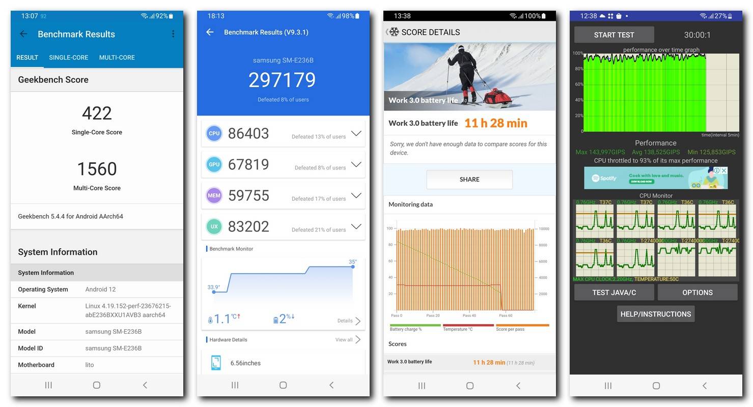 Moving now to performance, the Galaxy F23 is the first phone in Samsung’s F series lineup to feature a Qualcomm Snapdragon SoC. Specifically, the device harbours the Snapdragon 750G chipset, popular in the mid-range segment two years back. Now in an affordable phone, the 750G can’t be considered underwhelming, as my usual daily needs on the F23 were accomplished without a hitch. What I mean by that is normal tasks like app switching, media surfing or internet browsing on Chrome will not be problematic. I do have concerns, however, about the 4GB LPDDR4 RAM which feels slightly inadequate for today’s needs and you might have to shell out that extra Rs 1,000 for the 6GB version. Internal storage remains at 128GB UFS 2.1 across both versions. The device doesn’t heat up during CPU intensive tasks and the CPU Throttle benchmark showed that the SoC was able to maintain 93 percent of its peak capacity during the 30-minute run. Benchmark numbers are not as promising, however, with a Geekbench 5 multi-core score of 1,560 and an Antutu V9.1.3 result not even crossing the 300,000 mark. Talking about BGMI, the device is capable of sustaining Ultra (45fps) frame rate at Balanced graphics, which is about what most phones in the price range can accomplish.