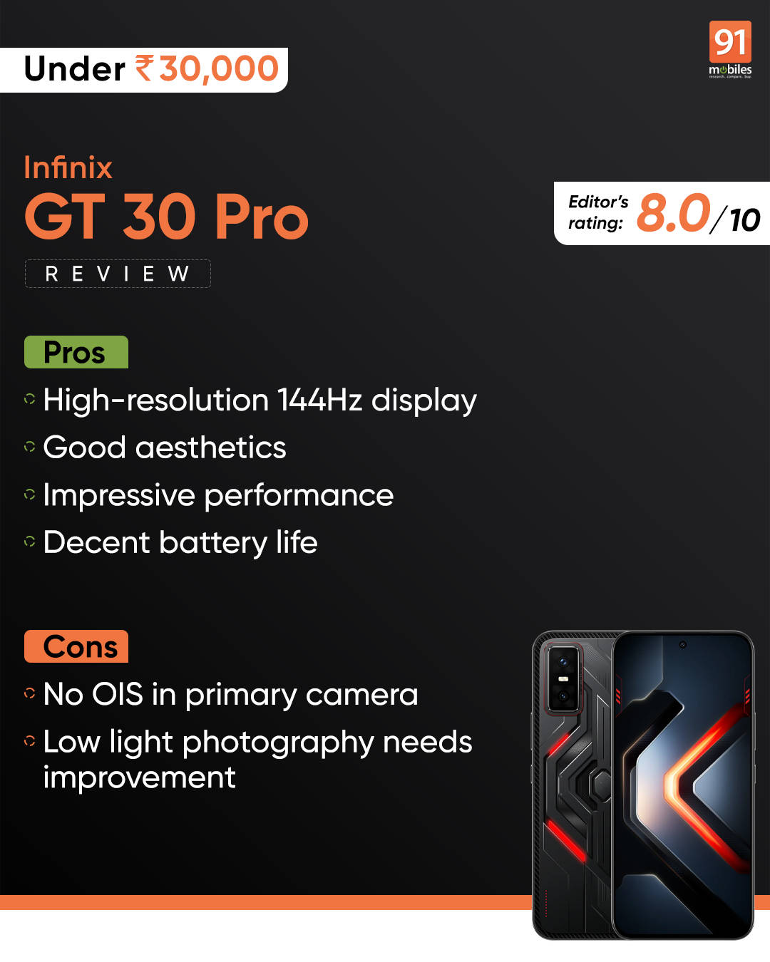 Verdict: The Infinix GT 30 Pro 5G+ should be a compelling buy for gamers who don’t want to spend a lot on a daily driver. The handset offers a crisp 144Hz display, dependable performance, and useful gaming features like GT Shoulder Triggers. The smartphone even sports a stylish design, runs smoothly, and delivers impressive battery life. On the other hand, low-light photography is not its strong suit, and the lack of OIS could also be a drawback for some.