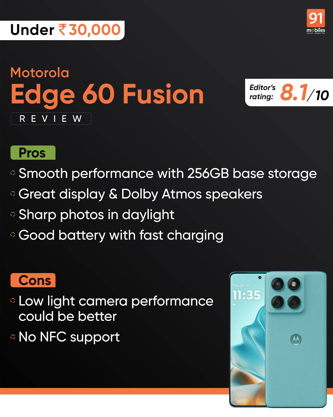 Verdict: The Motorola Edge 60 Fusion is a well-priced priced all-rounder that gets most things right. With solid multimedia performance, clean software, reliable battery life, capable cameras, and ample storage, it’s a capable contender that should be on the top of the shortlist for those seeking a well-balanced phone. The drawbacks worth keeping in mind are the not-so impressive low-light camera performance and lack of NFC support.