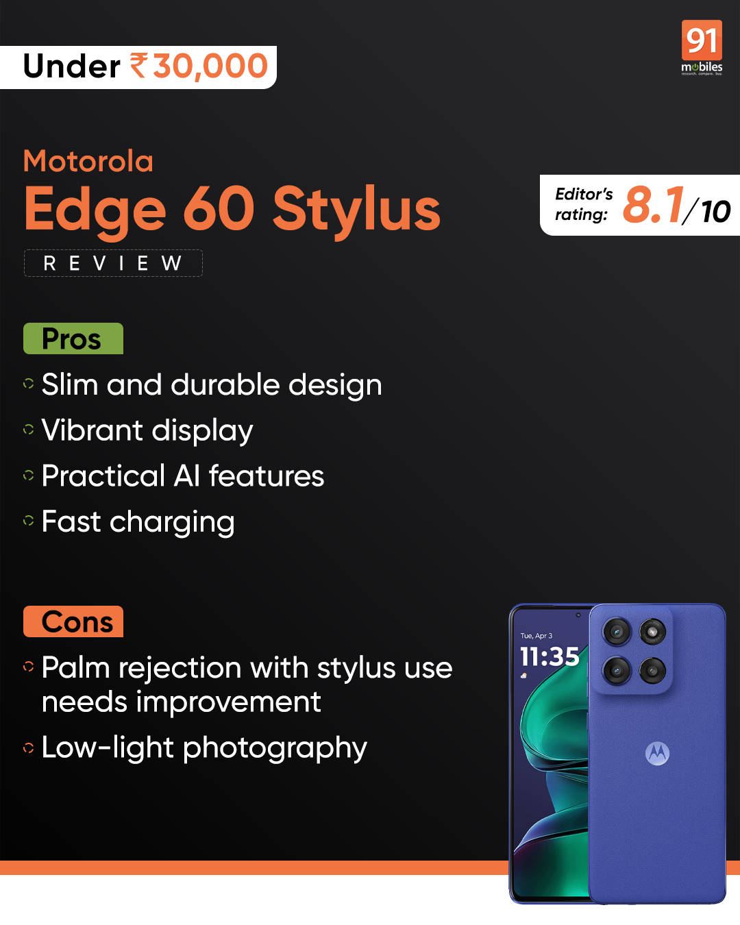 Verdict: The Edge 60 Stylus comes across as a good choice for productivity users in the sub-Rs 25K segment. Aspects like the AI features on offer, along with the display quality and capable cameras, help make Motorola’s latest offering stand out. What sets this phone apart is the bundled stylus, a feature previously seen only on Samsung’s “Ultra” smartphones. While the implementation is not flawless, Motorola has raised the bar by making stylus support accessible at an affordable price point.