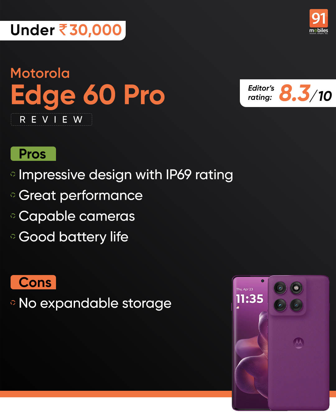 Verdict: The Motorola Edge 60 Pro is a solid upgrade over its predecessor, offering better performance, a sleek design, and good cameras. Its impressive battery life and IP69 rating make it a compelling option, especially under Rs 30K. While the lack of expandable storage and the presence of a few pre-installed apps are minor drawbacks, it is still one of the best choices in this price range.