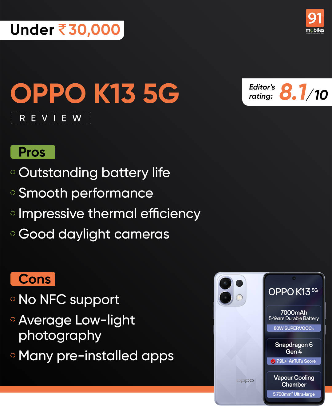 Verdict: The OPPO K13 is an all-rounder that impresses with its good battery life, fast charging capabilities, and efficient thermal management. While its overall performance is in line with other devices in its segment, the phone’s ability to stay cool when stressed makes it a compelling choice for power users. Its cameras perform consistently well in daylight, and the display is well-suited for indoor content consumption, making it a good choice for everyday users. However, it might not work well for those who prioritise a cleaner software experience or better low-light photography.