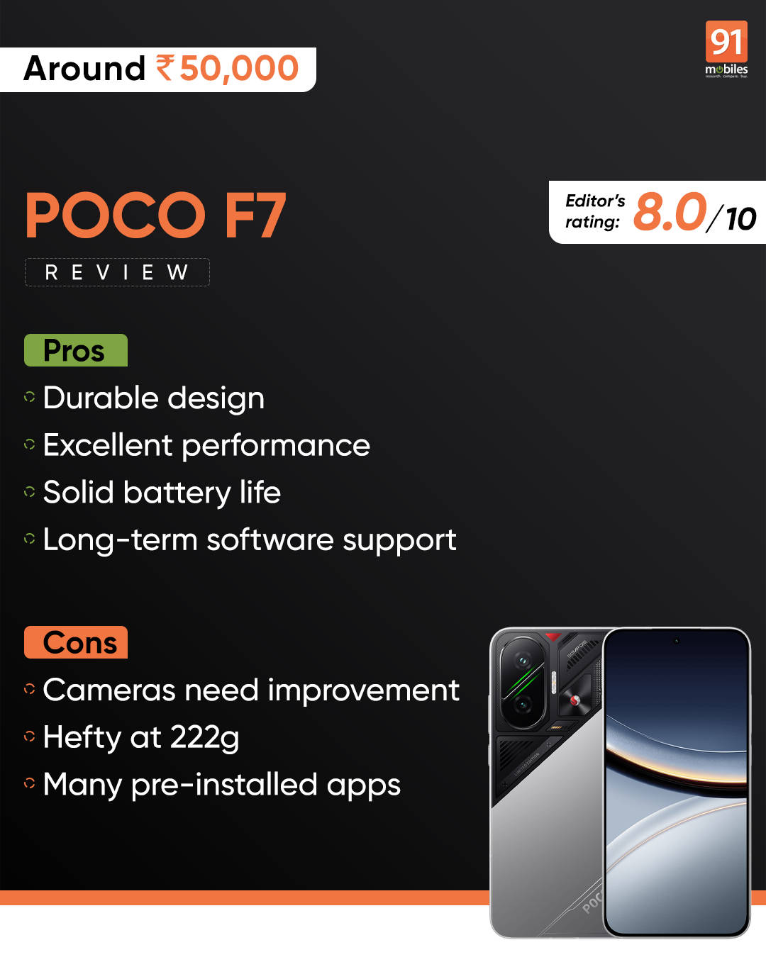Verdict: The Realme GT 7 offers tremendous value and ticks most boxes for those seeking a flagship-grade experience under Rs 40,000. Its key highlights include a new 4nm MediaTek Dimensity 9400e chipset, a massive 7,000mAh battery, and 120W fast charging. Unless you specifically need premium materials, better ultrawide photography, or a stock Android experience, the GT 7 is an easy recommendation in its price class.