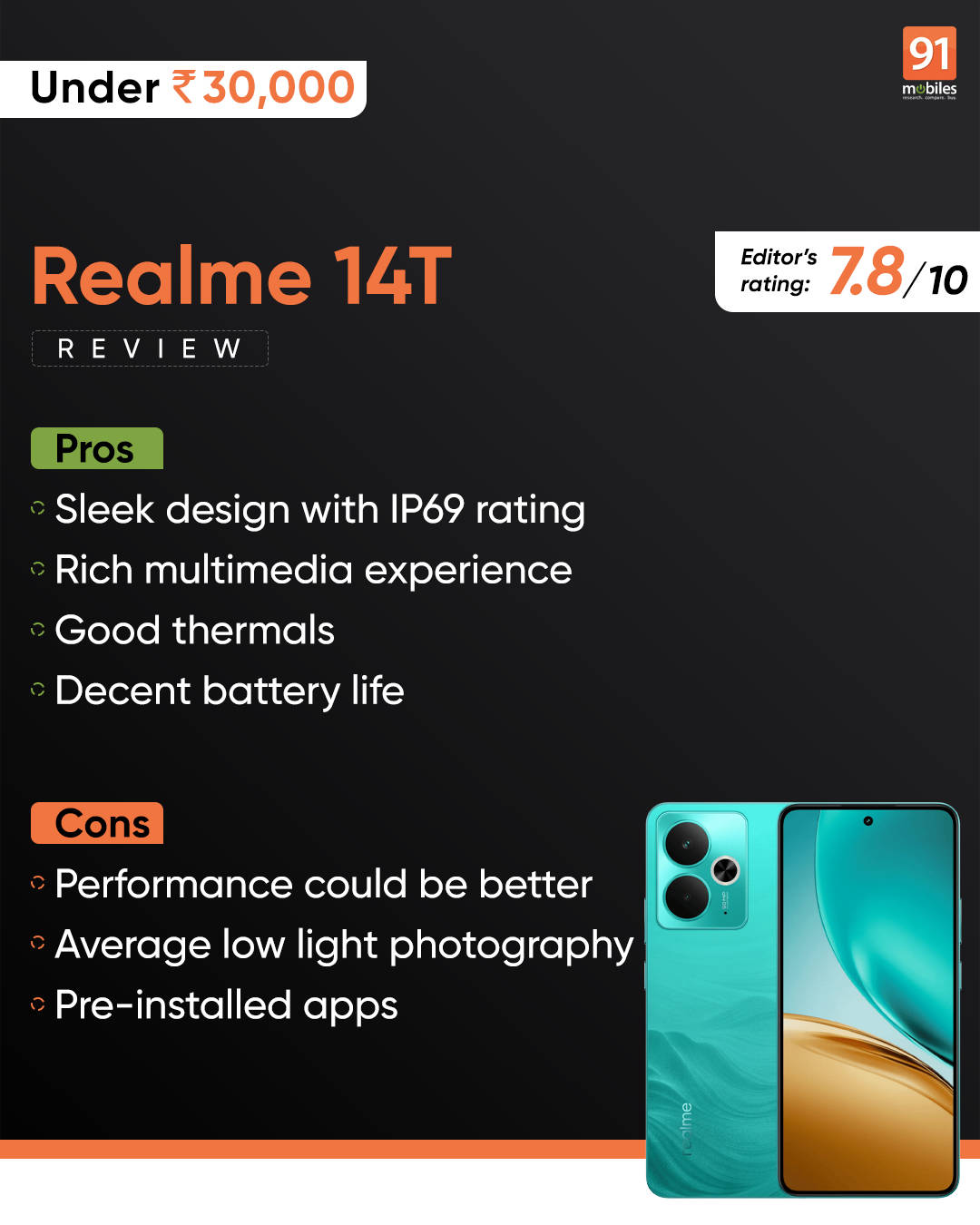 Verdict: The Realme 14T’s key highlights include its IP69-rated sleek design, vibrant display, solid thermals, and decent battery life. On the flip side, its performance could have been better, and the cameras struggle in low light. Overall though, if you’re looking for a reliable phone that covers all the basics, especially multimedia, battery life, and durability, the Realme 14T is worth considering.