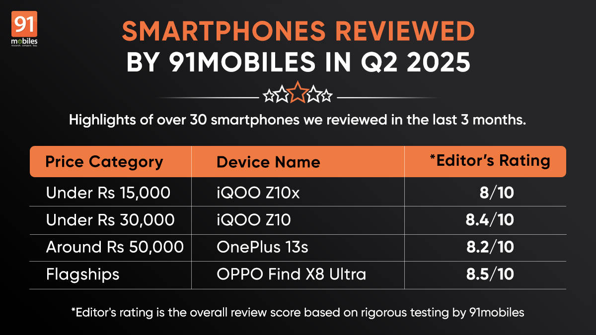 As expected, the April-May-June quarter was a busy one for team 91mobiles, with quite a few noteworthy smartphones making their way into the capable hands of our reviewers. While there weren’t too many flagships that launched in this time, and only a handful in the sub-Rs 50k price category, we did see quite a few launches in the sub-Rs 30k segment. The sub-Rs 15k segment also witnessed some action. Looking at the prices of the phones that came our way, though, it’s clear that the under Rs 30,000 segment is where most of the action is at the moment. From a brand standpoint, Motorola stood out with no less than five smartphones reviewed, with contenders from its well-rounded Edge 60 series and a couple of new flip phones from the Razr series getting covered. Most other brands like OPPO, Vivo, iQOO, Samsung, Realme, OnePlus, etc had something to offer during this time, with Acer making an entry into the Great Indian Smartphone Bazaar as well. Lava seemed to have gotten especially aggressive with a flurry of launches to close the quarter. While Xiaomi didn’t have any launches during these three months, its sub-brand POCO did create a few waves by taking the covers off a couple of new contenders. Let’s get a bird’s eye view of the smartphones we reviewed in this quarter.