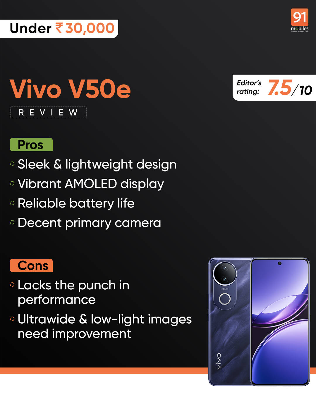 Verdict: The Vivo V50e is a compelling blend of style, performance, and battery life in the hyper-competitive sub-Rs 30K segment. While the cameras are reliable and prioritise a natural look in the results, the photos occasionally lack sharpness and vibrancy. That said, the smartphone handles daily tasks like calling, browsing, and light gaming well. But given that rivals like iQOO and POCO offer some noteworthy gaming-focused options in this price segment, power users who want more performance might want to look elsewhere.