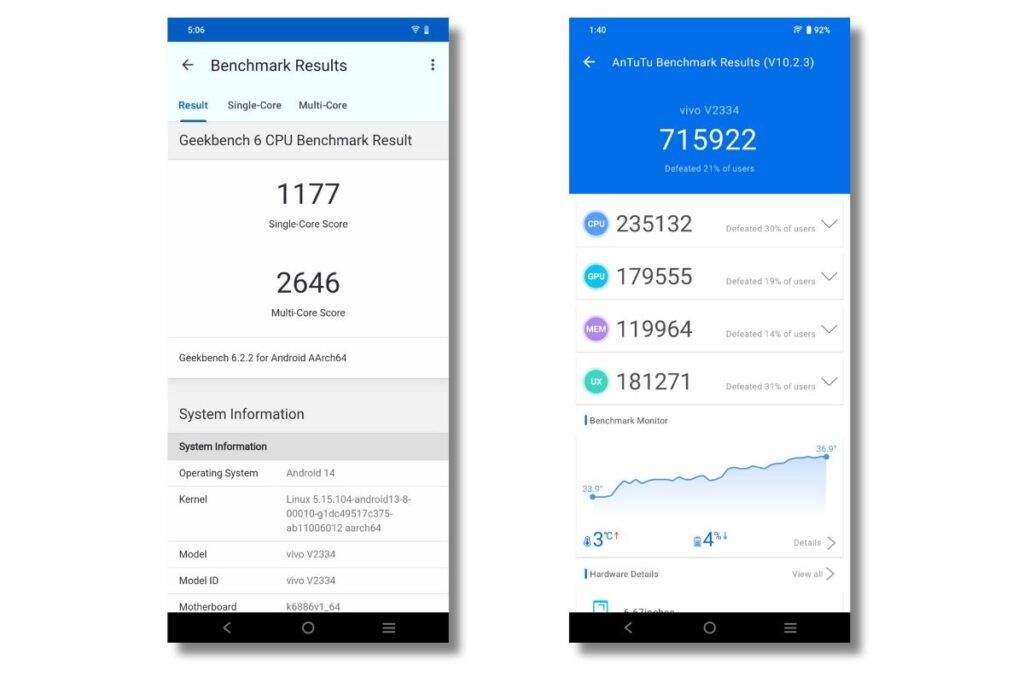 The MediaTek Dimensity 7200 chipset is one of the most powerful processors you’ll find in the sub-Rs 20,000 segment and the Vivo T3 gets it. The chipset delivers stellar benchmark results. We saw it with the iQOO Z9 5G and we see it once again with the Vivo T3 5G. We managed to get an AnTuTu score of 7.15 lakh, which is better than the Dimenity 6080-powered Redmi Note 13 (453,839) and Dimensity 7050-powered Realme Narzo 70 Pro (611,860).
