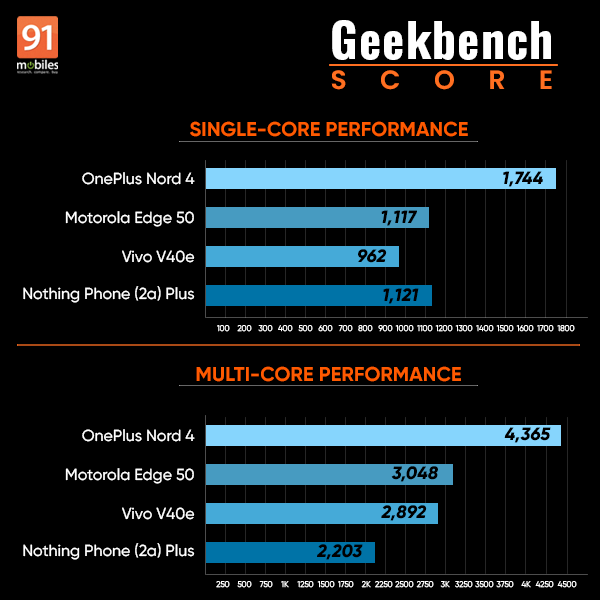 The Vivo V40e is powered by MediaTek Dimensity 7300 SoC, which has been quite popular in mid-range devices of late. As observed in the Vivo V40e performance review, the V40e handles graphically demanding games like BGMI, Call of Duty, and Real Racing 3 effortlessly, despite its modest synthetic benchmark scores. Impressively, it delivers better thermal management and more consistent FPS (frames per second) than the OnePlus Nord 4, which ranks higher in AnTuTu and Geekbench benchmarks within this segment.