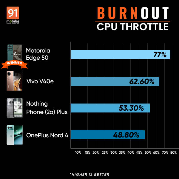 The OnePlus Nord 4 also excels in capturing daylight and ultrawide images, offering superior detail and pleasing colours. Moreover, the Vivo V40e’s portrait mode, its standout feature, isn’t that impressive. Our in-depth review of the Vivo V40e cameras revealed that the Nothing Phone (2a) Plus, OnePlus Nord 4, and Motorola Edge 50 all performed better in edge detection and facial details. However, it’s worth mentioning that the Vivo smartphone delivers more accurate skin tones. The phone even features a Smart Aura light to capture portraits with superior details in low light.