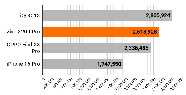 The iQOO 13 scores the highest among the competitors on AnTuTu with the Snapdragon 8 Elite chipset, which isn’t surprising since the iQOO 13 is a performance-centric phone. However, the Vivo X200 Pro is not too far behind, highlighting the Dimensity 9400 is almost as good in overall performance. Interestingly all three Android phones scored higher than Apple’s A18 Pro chipset that’s powering the iPhone 16 Pro.