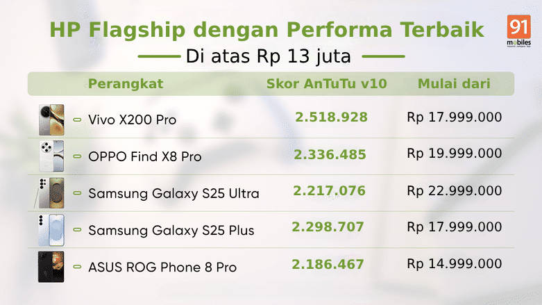Tim 91Mobiles telah menguji performa sejumlah ponsel dengan harga di atas Rp 13 juta untuk mengetahui pengalaman yang ditawarkan saat bermain game berat. Pengujian ini didasarkan pada skor AnTuTu v10 serta performanya saat memainkan BGMI. Berikut ini adalah daftar flagship seharga Rp 13 juta ke atas dengan performa terbaik yang tersedia di Indonesia.