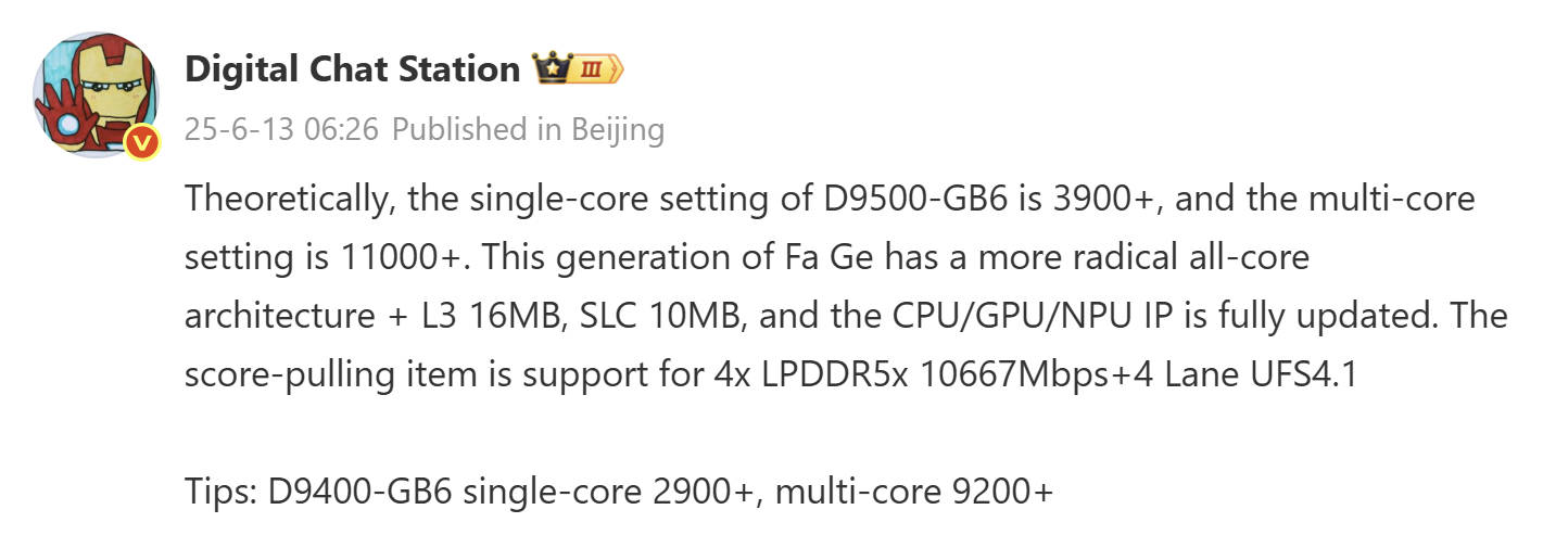 - Pembocor ulung Ice Universe juga mengumbar bocoran skor Geekbench dari Dimensity 9500 yaitu 3.900 poin single-core dan 11.000 poin multi-core. Masing-masing skor ini meningkat sebanyak 34,5 persen dan 19,6 persen dibandingkan Dimensity 9400.