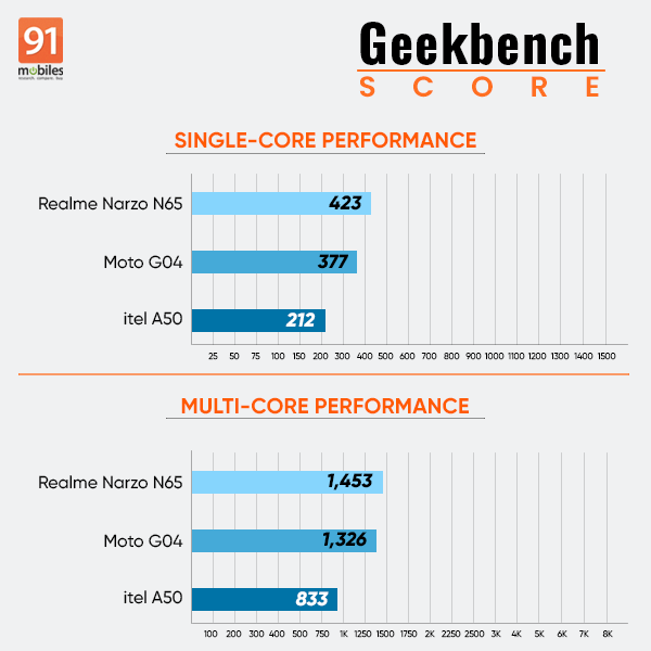 Itel A50 ditenagai oleh chipset Unisoc T603, sebuah prosesor entry-level yang mampu menangani tugas-tugas dasar. Namun, ini tidak sekuat SoC Unisoc T606 milik Moto G04. Kami menerima varian RAM 4GB dari smartphone itel ini, dan meraih skor 151.010 poin di AnTuTu, hampir 100.000 poin lebih rendah dari rivalnya. Demikian pula, di Geekbench, A50 berhasil meraih skor 212 pada pengujian single-core dan 833 pada pengujian multi-core. Sisi baiknya, ponsel ini melambat hingga 63,2 persen dari kinerja puncaknya dalam tes Burnout CPU Throttle.