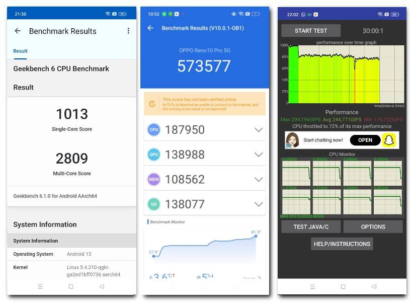 Di bagian dapur pacu Oppo Reno10 Pro 5G terdapat SoC Snapdragon 778G dari Qualcomm. Chipset berkemampuan 5G ini juga dapat ditemukan di beberapa smartphone kelas menengah lainnya, termasuk poco X5 Pro, iQoo Z6 Pro, dan samsung Galaxy M52. Performa Reno Pro 5G bukanlah yang paling cepat, tetapi secara efektif menjalankan pekerjaan yang diperlukan.